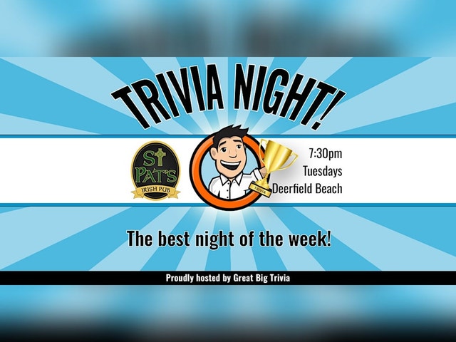 SEE YOU FOR TRIVIA NIGHT! Looking for a way to make your Tuesdays truly special? Join us at St. Pat's Irish Pub in Deerfield Beach for Great Big Trivia every Tuesday at 7:30 pm. St. Pat's provides the perfect backdrop for a memorable night, combining the charm of a classic Irish pub with a fun-filled event. Bring the whole family and enjoy their commitment to creating an enjoyable and vibrant atmosphere, complete with delicious food, your favorite drinks, and the most welcoming staff in town. It's more than just trivia; it's an opportunity to connect, relax, and have a great time in a place where you'll immediately feel at ease.