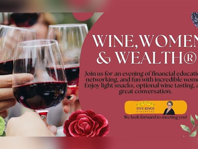 Great things happen when great women get together! Please join us for our next Wine, Women & Wealth® event! We bring together women in regional or national gatherings to share in elevating our understanding of money, how it can work better FOR us and enjoying the power of connections within a community. Part financial education, part networking and part girls-night-out, all ladies are sure to have a great time and make some great connections! Whether you are running a household, running a business, or just plain running to keep up with the demands of your job and these changing times, you are welcome here. There is a very informal wine tasting (not mandatory) and some snacks served too. Join us early! Networking starts at 6 p.m. and the program at 6:30 p.m. Feel free to invite a girlfriend, but be sure to tell us so we can plan appropriately. There is no cost to attend, and in case you are wondering but too polite to ask, there is nothing to buy, and nothing to join. And, if you would like, you'll have an opportunity to introduce yourself to this group informally and formally. Five Rings Financial Team Members help people to transform their finances. If you decide that you would like our services, you are welcome to request a personal private meeting without obligation or cost to you. We only work with volunteers, so you are under no pressure to become our partner or client. NOTE: This is a Five Rings Financial Sponsored event, therefore is not an event open to others in the Financial Services (Financial planners, Life Insurance and Annuities) industry. We ask that our guests respect and honor this request. Hope to see you there! Elsie Tracy 707-227-0948 elsie.tracy@gmail.com