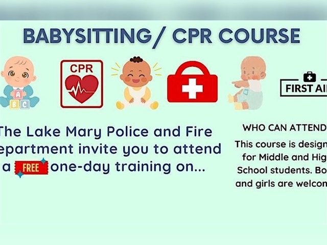 Babysitting/ CPR Course The Lake Mary Police and Fire Department invites you to attend a one-day-training on Babysitting Safety to include injury prevention, simple first aid, Babysitter Survival and Safety, fundamental skills on bathing, feeding, playtime, household, and personal safety. Also included will be an American Safety & Health Institute Infant and Child CPR course. This course is intended for Middle and High School students between the ages of 11-17. Boys and girls are welcome to attend. No parents or adults are allowed to attend this training. This class is FREE. If you would like to receive an individual CPR card there will be a $10 fee (CASH ONLY) collected the day of the class. Participants are NOT required to pay IF they do not want a CPR certification card. Lunch (Chick-fil-a) will be provided FREE to participants on behalf of Orlando Health. For all questions contact the Community Relations Division at (407)585-1341 or email communityrelations@lakemaryfl.com [https://www.eventbrite.com/e/copy-of-babysitting-cpr-course-tickets-1286001899299?aff=oddtdtcreator]