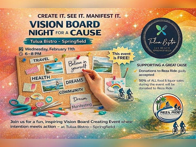 ✨ VISION BOARD NIGHT FOR A CAUSE ✨ at Tulua Bistro – Springfield • FREE EVENT — 🎉 • ALL supplies included at no cost (vision boards, magazines, images, scissors, glue & more) • Amazing food & drink specials 🍹🍗 – 2 for 1 cocktails – $2 beer – 75¢ wings • Donations gladly accepted ❤️ • 50% of ALL food & liquor sales during the event donated • Raffles benefiting Reza Ride 🎟️ • Learn about Reza Ride, a powerful movement that raises thousands of dollars for LGBTQ+ organizations 🌈 • Sign-up available for Reza Ride — add it to your 2026 vision board and be a part of the impact 🚴♀️✨