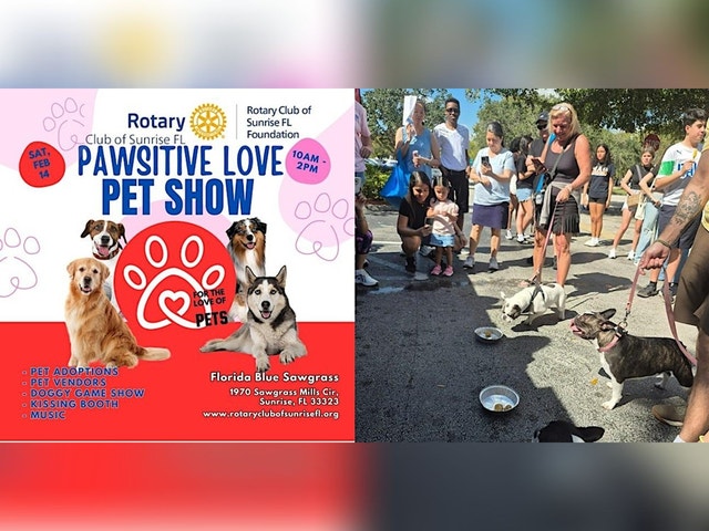 3rd Annual Pawsitive Love Pet Show FREE EVENT DATE:Saturday, February 14 TIME:10:00 am to 2:00 pm LOCATION:Florida Blue Health Insurance grounds, Sawgrass 1970 Sawgrass Mills Circle, Sunrise, FL 33323 The Rotary club of Sunrise FL annual pet show celebrating all pets with specialty vendors, a doggy game show, and kissing booth! Highlights include: 11:00 am - Special Pet Adoption Presentation with our Sunrise Fire Fighters 12:00 pm - Doggy Game Show 1:00 pm - Sunrise Police K9 demonstration CPR Demonstration Admission is free for you and your furry BFF. Don’t have a dog? Don’t miss out on the fun! An Animal Rescue will be on site, offering pets for adoption. Dogs must be on leash at all times. The Pet Show is presented by The Rotary Club of Sunrise FL and sponsored by Florida Blue Sunrise.