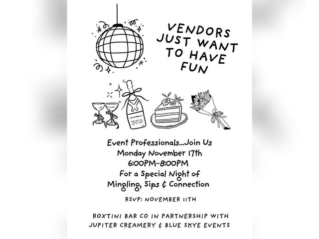 Welcome to Vendors Just Want to Have Fun! Come join us for an evening filled with exciting activities, delicious bites, and great company! This in-person event is the perfect opportunity for wedding vendors, event planners, photographers and anyone in the industry that wants to enjoy some mingling with others in the profession. Whether you're a seasoned vendor or just starting out, connection is what it's all about. Don't miss out on this chance to network, learn, and most importantly, have fun! Event Details: Date: 11-17-25 Time: 6:00PM - 8:00PM Location: Jupiter Creamery