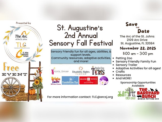Welcome to the 2nd Annual Sensory Fall Festival hosted by The Arc of the St. Johns, TLC, & CC! đ⨠Join us for a day of fall fun on The Arc of the St. Johns Campus! Enjoy engaging activities, sensory-friendly crafts, community connections, and resource exhibitors. This annual festival is a welcoming space for families and individuals of all ages and all levels of support needsâespecially those navigating developmental differencesâto celebrate the season and create lasting memories together. Donât miss this opportunity to experience the joy of fall in a supportive, sensory-friendly environment. We canât wait to see you there! đđ Register 1 Ticket per Family. Tickets not required for entry.