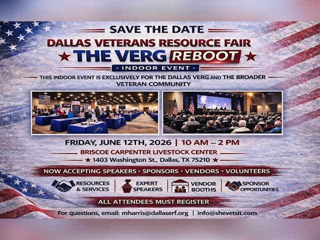 Dallas VERG Reboot 2026 | Sponsor, Vendor, Volunteer & Speaker Opportunities She Vets It Foundation presents the Dallas VERG Reboot 2026, in collaboration with the City of Dallas Veteran Employee Resource Group (VERG) and hosted by City of Dallas Parks & Recreation. This community-centered event is designed to reconnect, re-engage, and elevate veterans across the City of Dallas. The VERG Reboot brings together City veteran employees and the broader Dallas veteran community for a powerful day of leadership development, professional growth, and resource access. We are currently seeking: • Sponsors committed to supporting and investing in the veteran community • Vendors providing veteran-serving resources, services, and workforce opportunities • Volunteers ready to serve and support event operations • Speakers & Panelists who can share leadership insight, lived experience, and professional expertise that strengthens veterans across our city This is an opportunity to align your organization and voice with a civic-forward initiative focused on career advancement, leadership, and veteran well-being. 📅 Event Date: June 12, 2026 ⏰ 10:00 AM – 2:00 PM 📍 Briscoe Carpenter Livestock Center | Dallas, Texas For questions, email: mharris@dallaserf.org | info@shevetsit.com If you are interested in participating, please apply here: