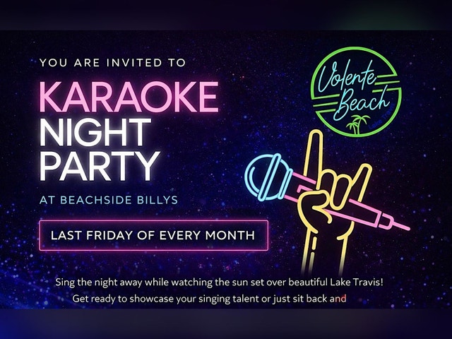 Looking for a fun night out in Austin? Join us for Karaoke Night at Beachside Billy’s, a lively, laid-back evening of music, drinks, and lake views at Volente Beach Resort & Waterpark on beautiful Lake Travis. Whether you’re ready to grab the mic or just want to sit back and enjoy the performances, Karaoke Night is all about good vibes, great music, and an unforgettable lakeside atmosphere. Bring your friends, make it a date night, or come solo and cheer on fellow singers—it’s always a blast. ✨ What to expect: * Open-mic karaoke for all skill levels * Full bar with cocktails, beer, and wine * Food available from Beachside Billy’s * Sunset views over Lake Travis * Fun, welcoming nightlife atmosphere Karaoke Night takes place on the last Friday of every month and is free to attend. Come early, grab a drink, and get ready to sing the night away by the lake! 🎶🍹