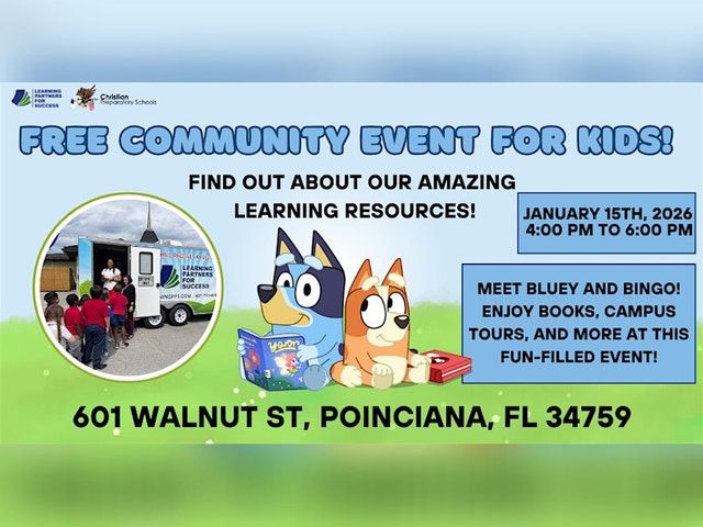 Free Community Day at Poinciana Christian Preparatory School South! Bring the whole family for an afternoon full of fun, learning, and adventure! Date: January 15th, 2026 Time: 4:00 PM – 6:00 PM Location: 601 Walnut St. Kissimmee, FL 34759 Event Highlights: Meet Bluey & Bingo LIVE! Say hello to the lovable pups everyone adores! FREE Book Giveaway from the Learning Partners for Success Book Fair! Family Fun Activities – Games, crafts, and activities for all ages! School Tours Available! Meet our amazing teachers, and learn more about Christian Prep! Free Community Event – Invite your family and friends for an evening of excitement and connection. We can’t wait to see you there!