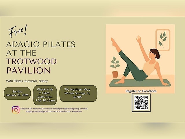 FREE ADAGIO PILATES EVENT @ TROTWOOD PAVILION WINTER SPRINGS Join us in person for an energizing session of Adagio Pilates at the cozy Trotwood Pavilion in Winter Springs! It's a great chance to stretch, strengthen, and find your flow in a friendly and relaxed atmosphere. Whether you're a Pilates pro or just curious, come move with us and feel fantastic. Don't miss out on this fun community gathering—see you there!