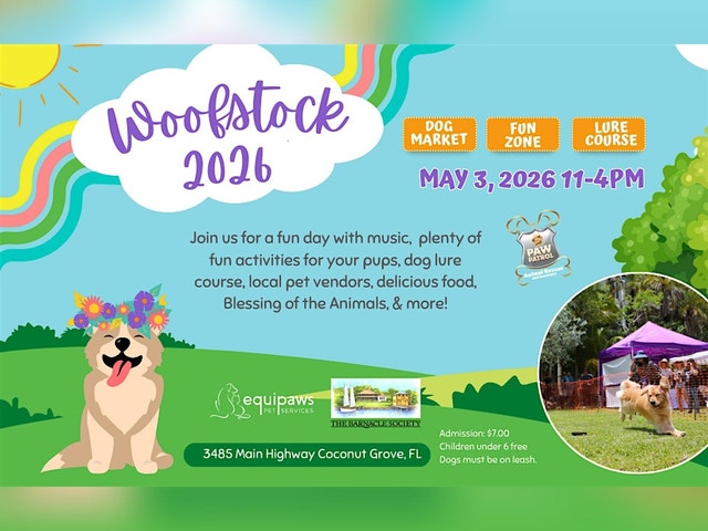 Woofstock 2026 comes back to The Barnacle on Sunday, May 3, from 11 AM - 4 PM! Bring your pups and enjoy a beautiful breezy day full of activities, local pet vendors, delicious food and drinks, while supporting Paw Patrol Animal Rescue and the park! There will be plenty of opportunities for your pups to mingle and have fun with the Happy with Dogs canine lure course, the fun zone, kiddie pools, fur-friendly vendors, delicious treats, and more! Let's bring our dog community together for a gorgeous day at the park! $7 admission, kids under can enter for free. Sign your doggie waiver in advance! [https://www.thebarnacle.org/woofstockwaiver] Your pups will enjoy: * The Happy with Dogs Lure course * The Dog Play Zone * Doggy Yoga with Tiffany * Awesome pet vendors and live music * Arts and Crafts for your pups * Delicious pizza, coffee, tea, and more * Flower power portraits with Lorena Cora Pet Photography * A Blessing of the Animals, delicious food and drinks, and more! * š¾ā®ļøš¾ā Best of all, this is benefiting Paw Patrol Animal Rescue and the Barnacle! How to pay: Regular admission is $7, and children under 6 enter for free. Please pay in person at the gate or ahead of time here. [https://www.thebarnacle.org/woofstock/p/woofstock-admission] Pre-purchase your flower power portraits here. [https://www.thebarnacle.org/woofstock/p/pawtraits] They are $20 before the event, and $25 the day of. Thank you for helping us raise money for Paw Patrol Animal Rescue and the Park! Sunday, May 3, from 11 AM - 4 PM.ā The Barnacle Historic State Parkā 3485 Main Hwy, Miami, FL 33133ā Well-behaved, socialized dogs are always welcome during the parkās regular business hours. Dogs must be leashed at all times. Leashes must be 6 feet long or shorter, with no retractable leads unless necessary. Please don't bring your puppy unless it's over 16 weeks old, fully vaccinated, and fully boostered to ensure the puppy and other dogs are safe. Photos and videos will be taken by Equipaws Pet Services at the event for The Barnacle Historic State Park, Equipaws Pet Services, its partners, and vendors. Attending the event signifies your consent to have your picture or video taken and be used in future promotions and websites.