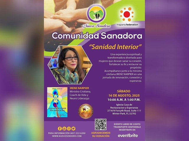 "Sanidad Interior y Fortaleza Espiritual" con Nuevo Sendero Foundation Una experiencia espiritual y transformadora diseñada para mujeres que desean sanar su corazón, fortalecer su fe y restaurar su propósito. Acompáñanos junto a la ministra cristiana, Coach de Vida y Neuro Liderazgo, IRENE NARPIER en una jornada de renovación, conexión y esperanza y el conversatorio de su libro “Sanidad Interior a la manera de Dios”. Sábado, Agosto 16, de 10:00 a.m. a 1:00 p.m. Lugar: Iglesia Casa de Restauracion y Esperanza 2716 N Forsyth Road, Suite 111, Winter Park, FL. 32792 Evento libre de Costo. Transportación disponible previa reservación al 407-332-6200 Visita : www.nuevosendero.org