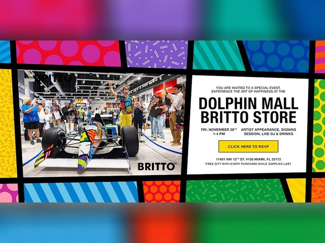 Join us on Friday, November 28, 2025, at Dolphin Mall for a day bursting with vibrant colors, art, and celebration! 📍11401 NW 12th St #156, Miami, FL 33172 [https://www.google.com/maps?s=web&rlz=1C1ONGR_enUS1151US1153&lsa=H3gIEBABGAEiEwiy7s6j9NeMAxVTTTABHTgiA20oATIA&vet=12ahUKEwiy7s6j9NeMAxVTTTABHTgiA20QzooKegQILhAU..i&cs=0&um=1&ie=UTF-8&fb=1&gl=us&sa=X&geocode=KQtNUw_Fv9mIMQkW4Hw2pe4w&daddr=11401+NW+12th+St+%23156,+Miami,+FL+33172] - Entrance 5 🚗 Free parking available. Complimentary parking is located at entrance 5 between Burlington and Marshalls HomeGoods Meet the world-renowned artist Romero Britto in person and immerse yourself in his joyful, creative world. Plus, don’t miss this exclusive chance for an artist signing with Romero himself! This will be an unforgettable event, full of artistic inspiration and lively energy! Don’t miss out—mark your calendars for a day of color, excitement, and fun! 🎨✨