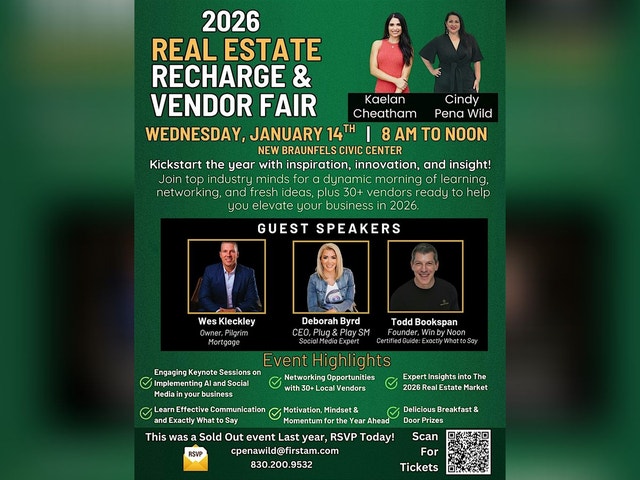 2026 Real Estate Recharge and Vendor Fair Join us for the 2026 Real Estate Recharge event at the New Braunfels Civic/Convention Center! Get ready to network, learn, and recharge your real estate game. This in-person event is your chance to connect with industry leaders, discover new trends, and gain valuable insights to boost your success in the real estate world. Don't miss out on this exciting opportunity to recharge your career and take it to the next level!