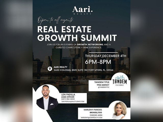 JOIN US AT THE AARI REALTY END OF YEAR SUMMIT! Free event for real estate pros who are ready to step into 2026 with purpose. Learn the mindset, systems, and daily structure that help agents build real momentum in a shifting market. Real talk. Real strategy. Real results. AARI Realty End of Year Summit Mindset. Structure. Execution that moves the needle. A high level real estate conversation focused on elevating your business and creating clarity for the year ahead. Join us on December 4 for a summit built to reset your focus and sharpen your approach. You will get insight, connection, accountability, and clear steps you can apply immediately. This month’s lineup features Mindset and Momentum Session with Marlenyi A deep dive into the beliefs, habits, and confidence you need to stay consistent in a changing market. Learn how top performers think, prepare, and keep their energy aligned with their goals. Daily Execution Framework A practical walk through the specific actions, time blocks, and business structure that help agents build predictable growth. No fluff. Just what works. Breakthrough Agent Conversation Hear from agents who rebuilt their consistency, elevated their standards, and pushed through resistance. Real stories. Real growth. Real strategies that created traction. AARI Realty Community Connection An open space for agents across Southwest Florida to network, share insights, ask questions, and build meaningful relationships that support long term success. This summit is designed to help you sharpen your mindset, strengthen your confidence, and walk into 2026 with clarity and momentum. Whether you are new or seasoned, you will leave with insights and practical steps you can start using right away.