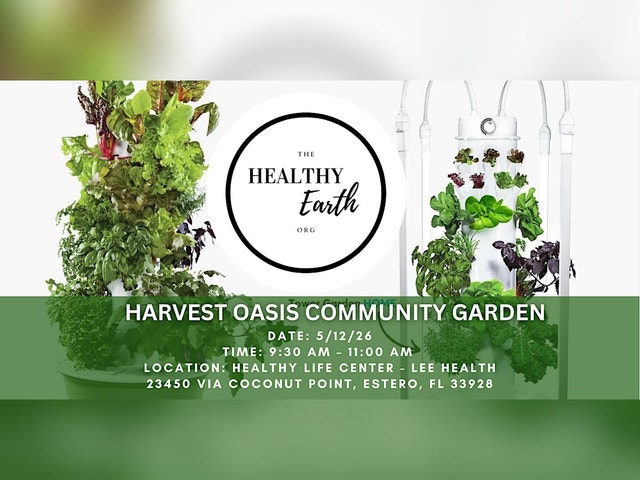 Event: Harvest Oasis Community Garden Maintenance Day Date & Time: 5/12/2026 | 9:30 AM - 11:00 AM Location: Lee Health - Healthy Life Center Coconut Point, Estero, FL. 23450 Via Coconut Pt, Estero, FL 33928 Our community garden is in need of some TLC, and we’ll be planting and weeding to help it thrive. Be prepared to get your hands dirty! Please wear comfortable clothing, closed-toe shoes, and bring a refillable water bottle. We’ll provide all the necessary tools, plus snacks and water—just bring your energy and enthusiasm! Directions: Harvest Oasis Community Garden is located at the outdoor pavilion at Lee Health - Healthy Life Center Coconut Point. Once you enter the parking lot, take an immediate right and continue to the end until you see the 4 vertical hydroponic garden. We can’t wait to see you there!