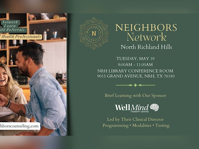 NORTH RICHLAND HILLS NEIGHBORS NETWORKING EVENT Welcome NRH Neighbors! Join us for a fun networking event at North Richland Hills Library Conference Room from 9:00 AM to 11:00 AM (Central Time) on the third Tuesday of each month. Connect with fellow mental helath professionals, share resources, and build referrall partners in a casual setting. Don't miss this opportunity to expand your network and enjoy some great treats! See you there! Venue: North Richland Hills Library, 9015 Grand Ave, North Richland Hills, TX 76180 Time: 9:00 AM - 11:00 AM Date: Third Tuesday of each month PLEASE RSVP using the link below: https://www.neighborscounseling.com/event