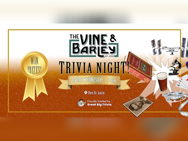 ABOUT TRIVIA NIGHT AT THE VINE & BARLEY Join us for a night of fun and friendly competition every Wednesday from 7-9 PM at The Vine & Barley in Port St. Lucie. Enjoy delicious food, craft beers, and fantastic wines while you test your trivia skills. Gather your friends, form a team, or fly solo as you compete for exciting prizes. Don't miss out on the fun! The Vine & Barley offers a relaxed atmosphere and a diverse selection of beverages to complement your trivia night. Whether you're a beer connoisseur or wine enthusiast, you'll find something to satisfy your taste buds. Come see why this place is a favorite destination! Grab your friends, mark your calendars, and get ready for a night of laughter, excitement, and friendly trivia competition at The Vine & Barley.