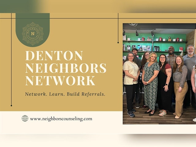 DENTON NEIGHBORS NETWORKING EVENT Welcome Denton Neighbors! Join us for a fun networking event at Patchouli Joe's Books & Indulgences from11:00 AM to 1:00 PM (Central Time) on the fourth Wednesday of each month. Connect with fellow mental helath professionals, share resources, and build referrall partners in a casual setting. Don't miss this opportunity to expand your network and enjoy some great treats! See you there! Venue: Patchouli Joe's Books & Indulgences, 221 W Hickory St, Denton, TX 76201 Time: 11:00 AM - 1:00 PM Date: Third Wednesday of each month PLEASE RSVP using the link below: https://www.neighborscounseling.com/event