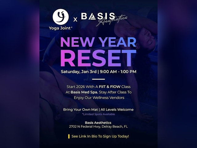 YOGA JOINT & BASIS AESTHETICS: HEALTH IS WEALTH NEW YEAR EVENT Kickstart your year with us at the Yoga Joint & Basis Medical Health is Wealth event! Join in person for a fun, relaxing day focused on boosting your health and wellness. Choose from back to back YJ FLOW & FIIT classes, services from Basis Aesthetics, and fun wellness vendors. Bring your own mat and parking will be available on site.