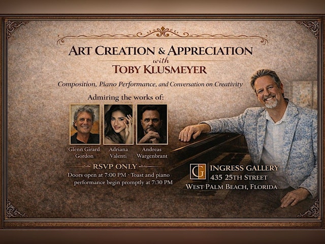 ART CREATION & APPRECIATION WITH TOBY KLUSMEYER Join composer and pianist Toby Klusmeyer for an intimate evening of art creation and appreciation, featuring live piano performance, original composition, and thoughtful conversation on creativity, held within the curated environment of Ingress Gallery in West Palm Beach. This seated piano performance explores how music and visual art are conceived, shaped, and refined over time. Guests are invited not only to listen, but to engage with the creative process itself—through sound, reflection, and open discussion. In addition to the musical performance, the program includes represented works by Adriana Valenti, Andreas Wargenbrant, and Glenn Girard Gordon, offering a visual dialogue that complements the themes explored through music and conversation. EVENT DETAILS 📍 Ingress Gallery 435 25th St, West Palm Beach, FL 📅 Thursday, January 8, 2026 🕖 Doors Open: 7:00 PM 🕢 Toast & Seated Piano Performance Begin Promptly: 7:30 PM 🎹 Format Seated piano performance followed by conversation Limited to 30 guests · RSVP required