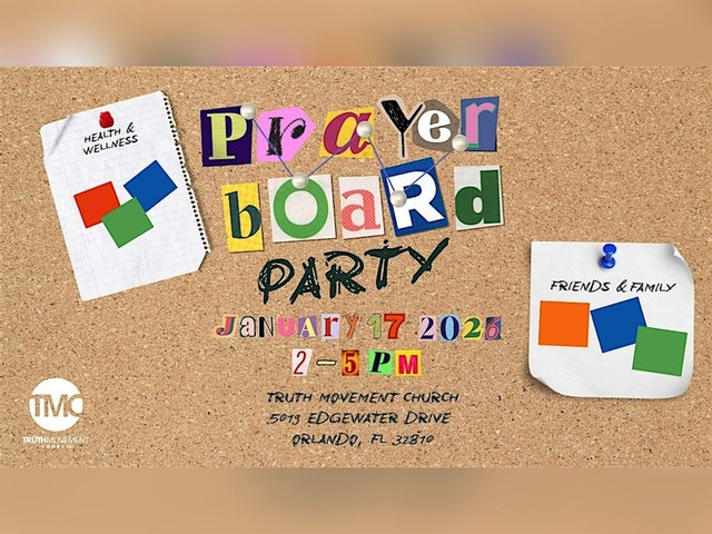 Join us for a meaningful and creative experience as we create personalized prayer boards to help you stay organized and spiritually focused for 2026. Your prayer board will serve as a visual reminder of the things you’ve brought before God and the many ways He has remained faithful to His promises. Boards may include Bible verses, personal prayer requests, goals, reminders of people or situations to pray for regularly, spaces for answered prayers, gratitude lists, and spiritual growth goals. As we create, we’ll also connect in fellowship sharing testimonies and having open conversations about what we’re trusting God for in this season. This event offers both a creative and spiritual opportunity to deepen your relationship with God while building accountability in your prayer life. All supplies will be provided, including boards, markers, scissors, stickers, and other craft materials. Feel free to bring any additional items you’d like to personalize your board. Truth Movement Church 5019 Edgewater Drive, Orlando, fl 32810 January 17, 2026 2pm - 5pm Food & Drinks Provided