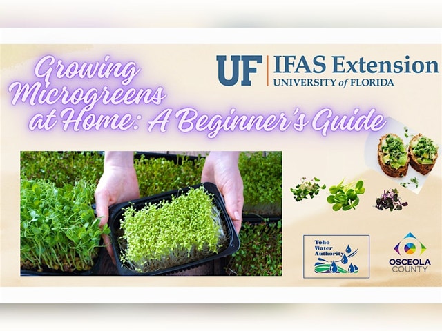 JOIN US FOR A FUN AND PRACTICAL INTRODUCTION TO GROWING MICROGREENS AT HOME! THIS CLASS IS PERFECT FOR GARDENING ENTHUSIASTS WHO WANT TO ADD A FRESH, NUTRITIOUS TOUCH TO THEIR MEALS USING EASY-TO-GROW GREENS. YOU’LL LEARN HOW TO GROW MICROGREENS INDOORS OR OUTDOORS USING SIMPLE MATERIALS, WITH STEP-BY-STEP GUIDANCE ON SEED SELECTION, GROWING METHODS, CARE, AND HARVESTING. NO SPECIAL EQUIPMENT OR EXPERIENCE NEEDED—JUST A LOVE FOR GARDENING AND FRESH FOOD! For individuals who require special ADA accommodations, please contact us at 321-697-3000 at least 10 business days prior to the program. INFORMATION TO MEET YOUR NEEDS WHO WE ARE THE UF/IFAS OSCEOLA COUNTY EXTENSION SERVICES IS AN OFF-CAMPUS BRANCH OF THE UNIVERSITY OF FLORIDA AND WORKS TO PROVIDE EVERYDAY SOLUTIONS FOR YOUR LIFE. EXTENSION IF FOR ALL SEGMENTS OF THE POPULATION REGARDLESS OF AGE, GENDER, RACE, DISABILITY, MARITAL STATUS, NATIONAL ORIGIN OR INCOME. WE: • OFFER EDUCATIONAL PROGRAMS BASED ON THE LOCAL NEEDS OF CITIZENS • UTILIZE A VARIETY OF EDUCATIONAL SERVICES SUCH AS CLASSES, INDIVIDUAL CONSULTATIONS, FIELD DEMONSTRATIONS, WEBSITE, EMAIL, AND PHONE. OUR MISSION THE UNIVERSITY OF FLORIDA/IFAS EXTENSION OSCEOLA COUNTY IS A FEDERAL, STATE, AND COUNTY PARTNERSHIP DEDICATED TO DEVELOPING KNOWLEDGE IN AGRICULTURE, HUMAN AND NATURAL RESOURCES, AND THE LIFE SCIENCES BY MAKING THAT KNOWLEDGE ACCESSIBLE TO SUSTAIN AND ENHANCE THE QUALITY OFF HUMAN LIFE. HORTICULTURE * Providing education to residents, builders, developers, and landscape professionals in: * Florida-Friendly Landscaping™ * Pest management * Landscape Professional Training * Pesticide Applicator Testing/CEUs * Vegetable Gardening * The Plant Clinic is open from 9:00 am to 3:00 pm to provide home gardening information and diagnostic services.