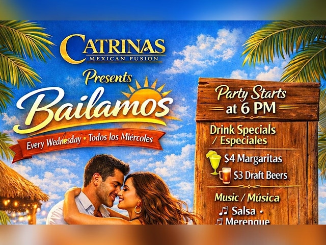 Join us on Wednesdays, when Catrina's Mexican Fusion hosts "Bailamos" Dj Flash and Hosted by Ileana (Blue Eyez Entertainment" from 6:00 PM until closing. Enjoy fantastic food and drink specials. It's a perfect way to relax post-work with great drinks, dining, and tunes...... Parties 5 or more receive 10% off meal! Delight in an evening of amazing music at Catrina's! great way