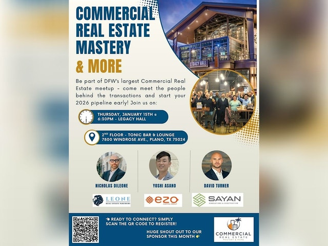 Your hosts Nick DiLeone, Yoshi Asano, and David Turner welcome you to DFW’s largest commercial real estate meetup at Legacy Hall at Legacy West (Plano). This meetup is built for connection and knowledge-sharing. It’s a space where newcomers can learn directly from experienced professionals, and where investors can explore investment opportunities and offerings within our network. Come for the conversations, the market intel, and the relationships that carry beyond one night. We’re property-type agnostic, so we welcome discussions across Multifamily, Industrial, Retail, Office, Self-Storage, RV Parks, and more. Where to find us: 2nd floor, right in front of the stairs/escalator at Tonic Bar & Lounge.
