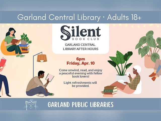 Join us for Silent Book Club® at the Garland Central Library, held once a month on Fridays at 6 PM—exclusively for adults 18+. Enjoy a relaxed, quiet reading environment without assigned books or discussion pressure. Bring your own book or browse the library’s collection to find something new. Need a library card? Sign up on the spot! Light refreshments will be provided. No registration required. Come unwind, read, and enjoy a peaceful evening with fellow book lovers!