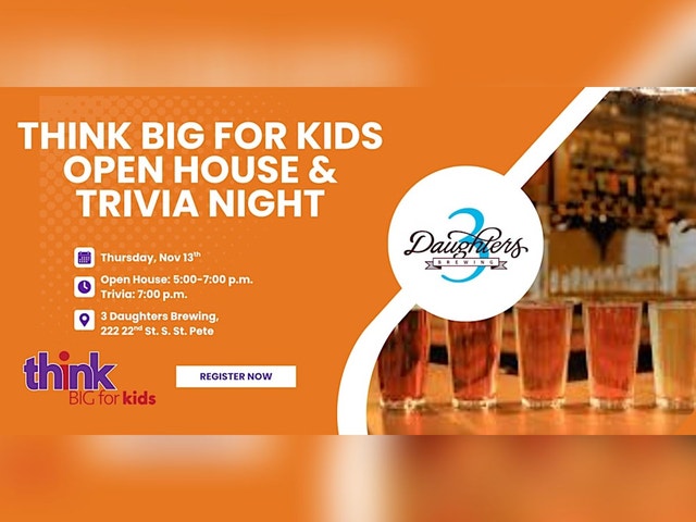 Join us for an evening of community and fun at Three Daughters Brewing in St. Pete! Learn how Think Big for Kids is breaking the cycle of poverty by empowering teens and young adults to excel in today’s workforce! Meet the team, connect with current volunteers, and discover how you can get involved in making a lasting impact! After the open house, stick around for Trivia Night at 7:00 p.m.! Form a team with new friends (or bring your own crew) and test your skills while enjoying great food, drinks, and good company. COST: FREE! WHAT’S INCLUDED * Complimentary heavy appetizers * One drink ticket per guest (🍺 or 🍷) * Bring a friend and you’ll get an extra drink ticket * Access to Think Big team members, current volunteers, and trivia fun WHY ATTEND * Meet like-minded professionals and community leaders involved in giving back * Learn about volunteer opportunities with Think Big for Kids and True North Society * Enjoy a relaxed, social atmosphere with food, drinks, and trivia * Take the first step in making a big impact on the next generation