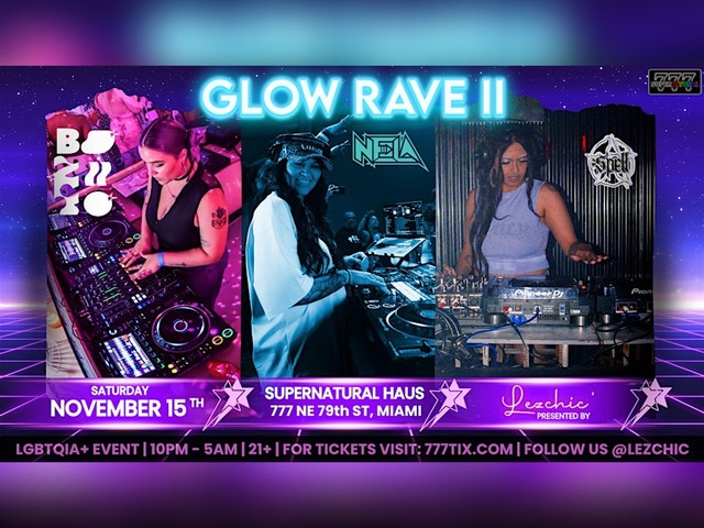 THE GLOW RAVE IS BACK ✨👽 @supernatural.haus [https://www.instagram.com/supernatural.haus/] SATURDAY NIGHT 11/15 featuring the biggest & baddest in the game 🔥 @bozito [https://www.instagram.com/bozito/] ‼️ @djnela [https://www.instagram.com/djnela/] ‼️ @soundsbyspell [https://www.instagram.com/soundsbyspell/] ‼️ 👏😲 📍 777 NE 79th st. Miami ⏰ 10pm-5am 🎟️ TICKETS AVAILABLE ONLINE ONLY ( NO TICKETS AT THE DOOR) (no cash) (debit/credit/apple pay at the bar only!) Expect: 🎵 Deep House · Afro House · EDM · Latin House · Top 40 Dance-Pop Remixes, Global & Funk House 🎶 🛍️ VENDORS 💃🏽 GOGO DANCERS 🛸 GLOW STATION & More! ✨ TO SPONSOR THIS EVENT 🚨 Please email lezchiclabrys@gmail.com, DM US or TEXT 786-929-2904 ➡️ In collaboration with @highvibe_smoke [https://www.instagram.com/highvibe_smoke/] ⬅️