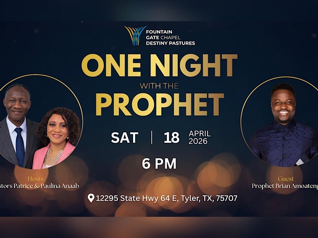 WHAT TO EXPECT Fountain Gate Chapel, Destiny Pastures invites you to a night of spiritual acceleration and supernatural breakthroughs that will shift your entire atmosphere. Under the prophetic anointing of guest speaker Prophet Brian Amoateng, prepare for a time of divine impartation that will leave your life forever changed. EVENT DETAILS * Date: Saturday, April 18, 2026 * Time: 6:00 PM * Location: 12295 State Hwy 64 E, Tyler, TX 75707