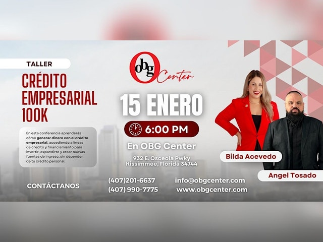 TALLER: CRÉDITO EMPRESARIAL 100K 📅 15 de enero 🕕 6:00 PM 📍 OBG Center – Kissimmee, FL ¿Sabías que tu negocio puede acceder a líneas de crédito y financiamiento sin depender de tu crédito personal? Este taller está diseñado para dueños de negocios, emprendedores y profesionales que desean aprender a utilizar el crédito empresarial como una herramienta estratégica para crecer, invertir y generar nuevas oportunidades de ingreso. ¿QUÉ APRENDERÁS EN ESTE TALLER? ✔️ Cómo estructurar correctamente tu negocio para calificar a crédito empresarial ✔️ Estrategias para acceder a líneas de crédito y financiamiento ✔️ Cómo utilizar el crédito empresarial para expandir, invertir y escalar tu negocio ✔️ Errores comunes que debes evitar al trabajar con crédito comercial ✔️ La diferencia entre crédito personal y crédito empresarial ¿A QUIÉN VA DIRIGIDO? 🔹 Emprendedores que están comenzando 🔹 Dueños de negocios establecidos 🔹 Profesionales que desean formalizar y fortalecer su empresa 🔹 Empresarios que quieren crecer sin poner en riesgo su crédito personal SPEAKERS: 👩💼 Bilda Acevedo – Consultora Empresarial | OBG Center 👨💼 Ángel Tosado – Experto en Crédito Empresarial LUGAR: 📍 OBG Center 932 E. Osceola Pkwy Kissimmee, FL 34744 📞 (407) 201-6637 | (407) 990-7775 📧 info@obgcenter.com 🌐 www.obgcenter.com ✨ Cupos limitados. Este taller forma parte de nuestra serie mensual de workshops diseñados para impulsar el crecimiento y la formalización de los negocios en nuestra comunidad. 👉 Reserva tu espacio hoy y comienza a construir el crédito que tu negocio necesita para crecer.