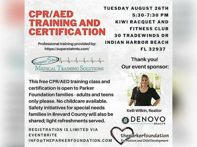 This free CPR/AED and First Aid training class and certification is open to Parker Foundation families. Adults only please. No childcare available. Safety initiatives for special needs families in Brevard County will also be shared. Light refreshements served. Registration is limited, please register as soon as possible. We are thankful to our sponsor, Kelli Wilkin, Realtor with Denovo Realty, for helping to provide and secure the services of Superstat Medical Training Services for this Speak Through Education event.