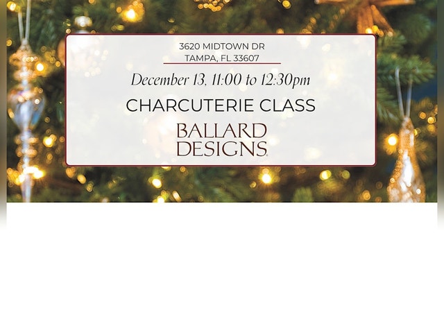 Come join us at Ballard Designs Tampa Showroom for a Charcuterie Board demonstration. Enjoy a Signature Cocktail and sample the Charcuterie while learning fun Holiday Decorating ideas. Event kicks off at 11am.