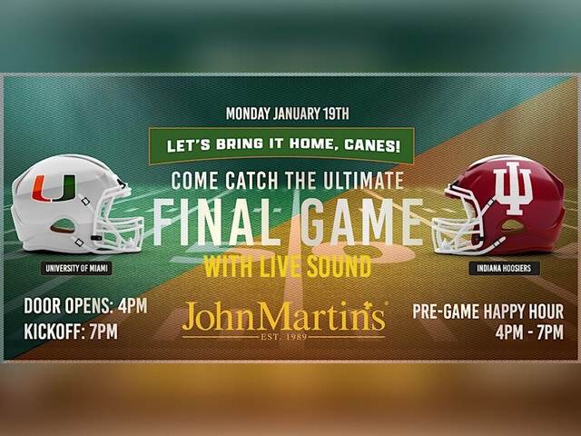 🏈 Game Day at JohnMartin’s 🏈 It’s the ultimate showdown and we’re bringing it home, Canes! Join us Monday, January 19th for the final game, shown with live sound so you don’t miss a single play. Catch the University of Miami vs. Indiana Hoosiers on our screens, fuel up during pre-game happy hour from 4–7PM, and settle in for kickoff at 7PM. Doors open at 4PM, so get here early, grab a drink, and lock in your seat. Whether you’re cheering loud or watching every down, this is the place to be for game night. 🍻🔥 - ------------ *THIS IS NOT A DINING RESERVATION* *THIS RSVP IS FOR STANDING ROOM ONLY* If you'd like to make a dining reservation please click here [https://johnmartinsmiami.com/reservations/]. For any questions please give us a call at (305)-209-0609 or email us at hello@johnmartinsmiami.com.