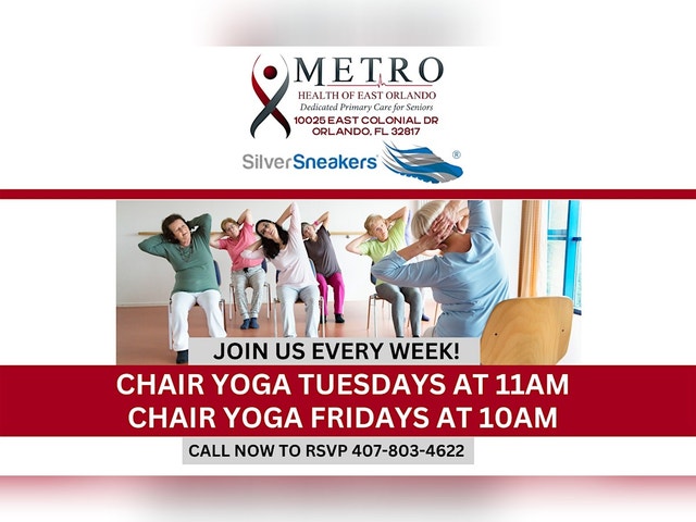 Join Us Every week at the MetroHealth East Orlando for Silver Sneakers Chair Yoga 10025 East Colonial Drive Orlando, FL 32817 | (407) 803-4622 Chair YOGA class TUESDAYS at 11am and FRIDAYS at 10AM At Metro Health, we take pride in offering an extensive network of primary care doctors and health professionals dedicated to seniors. Our unique approach is a nod to the timeless tradition of healthcare, where your primary care physician isn't just a doctor, but a partner in health, coordinating meticulously with specialists to ensure you receive the best comprehensive medical care experience. Healthcare that's more than just a visit to the doctors office. It's care that understands and grows with you that is what is unique about the MetroHealth Experience. Not a MetroHealth member yet? Join our Golden Timers Club now and get your free T-Shirt! https://goldentimersclub.com/