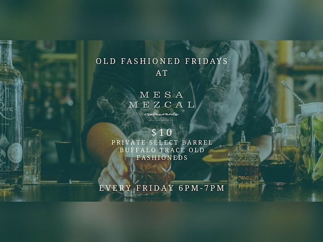 $10 Mesa Mezcal Private Label Buffalo Trace Old Fashioneds! Every Friday 6pm-7pm Complimentary self and valet parking. Full food and cocktail menu available (sold seperately). First come, first serve, no reservation needed!