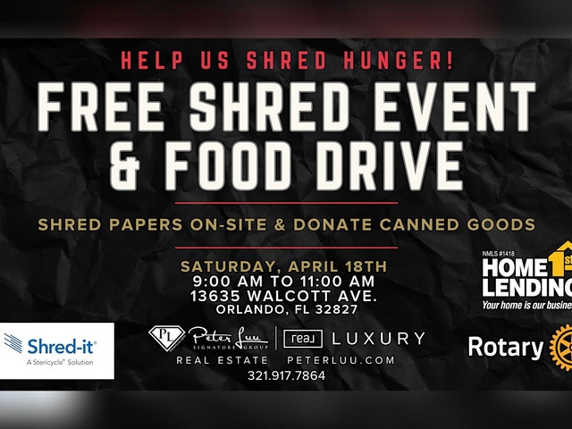 Join us for our annual Free Shred Event combined with a non perishable food drive benefiting the Rotary Club of Lake Nona. This event gives you a secure way to shred personal documents while helping families in need. Shred papers on site with Shred it and donate canned or non perishable food items. This event is open to the community and free to attend. Registration helps us plan and capture contact info. Date and Time Saturday April 18 9:00 AM to 11:00 AM Location Amazing Explorers Parking Lot 13635 Walcott Ave Orlando FL 32827 What to Bring Documents to shred Canned or non perishable food items Hosted By Peter Luu Signature Group In partnership with Shred it and Rotary Club of Lake Nona Cost Free Registration Note Please register to help us plan and ensure a smooth event experience.
