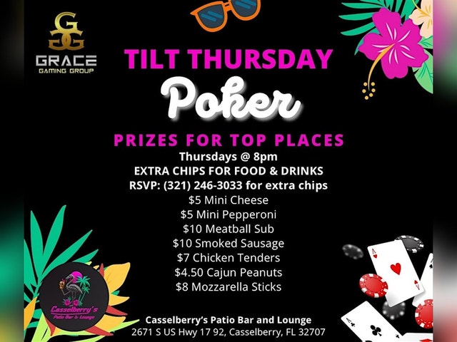 Tilt Thursdays is back at 8 pm every Thursday at Casselberrys. Texas Hold-Em tournament style poker with great prizes for top places. Excellent food and drink specials all night long. Reserve your seat at the table or text to confirm you're coming (321) 246-3033. Follow our social media pages for all details!
