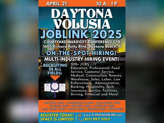 ARE YOU LOOKING FOR NEW OPPORTUNITY? DON'T MISS DAYTONA / VOLUSIA JOB LINK 2025! HUNDREDS OF TOP DAYTONA / VOLUSIA AREA JOBS ARE BEING FILLED ON THE SPOT AT THIS EVENT, *INCLUDING OPPORTUNITIES IN MELBOURNE, COCOA BEACH, DELAND, OCALA, ORLANDO, JACKSONVILLE, ORMOND BEACH PALM COAST AND MORE! OVER 200 JOBS ARE AVAILABLE IN ALL FIELDS! FROM ENTRY LEVEL TO PROFESSIONAL - JOBS INCLUDE EDUCATION, SCHOOL BOARD, LOGISTICS, GOVERNMENT, DRIVING, FINANCIAL, MEDICAL, SALES, TECHNICAL, WAREHOUSE, LANDSCAPING, LAW ENFORCEMENT, TEACHING, HOSPITALITY, FOOD SERVICE, CUSTOMER SERVICE AND MORE! ______________________________ FOR A LIST OF PARTICIPATING EMPLOYERS AND THEIR JOBS, VISIT HTTP://FLORDAJOBLINK.COM! [https://floridajoblink.com] COME GET HIRED ON THE SPOT! ______________________________ IF YOU'RE AN EMPLOYER: THIS IS THE MOST EFFECTIVE, RELAXED FACE-TO-FACE HIRING EXPERIENCE AROUND! YOU'VE BEEN WAITING FOR THIS EVENT! INTERVIEW ON THE SPOT AND HAVE FUN DOING IT! CALL US TODAY AT (813) 892-5502 OR VISIT HTTP://FLORIDAJOBLINK.COM [http://FloridaJobLink.com]. TAGS #UNITED STATES EVENTS #FLORIDA EVENTS #THINGS TO DO IN DAYTONA, FL #DAYTONA #JOB_FAIR #DAYTONA_EVENTS #DAYTONA_CAREER_FAIR #JOB_FAIR_NEAR_ME #DAYTONA_CAREER_FAIRS #DAYTONA_JOB_FAIR #DAYTONA_JOB_FAIRS #DAYTONA_JOBS #DAYTONA_HIRING_EVENT