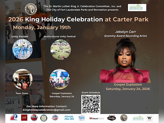 MLK DAY -PARADE MONDAY, JANUARY 19, 2026 AT 9:30AM http://Kingholidaycelebration.com/schedule [http://Kingholidaycelebration.com/schedule] WELCOME TO THE GOSPEL EXPLOSION LIVE MUSIC PERFORMANCE AND COMMUNITY SING! FEATURING GRAMMY AWARD-JEKALYN CARR Come join us at Joseph C. Carter Park for a soul-stirring event on January 24, 2026 at NOON -5:00 pm (Eastern Time). Get ready to be uplifted by amazing live music performances and join in a heartwarming community sing-along. Bring your family and friends for a day filled with joy, music, and togetherness. Let's make unforgettable memories together! Don't miss out on this special event that promises to inspire and bring people closer through the power of music. See you there!