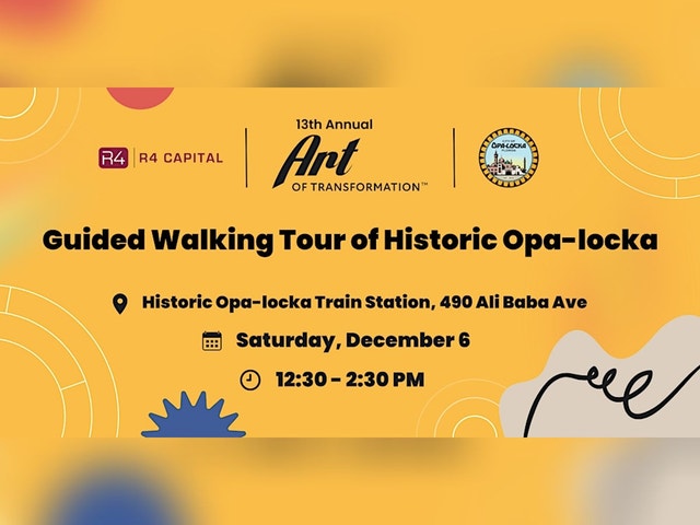 Guided Walking Tour of Historic Opa-locka WHO: Presented by Ten North Group in partnership with the Opa-locka Preservation Association. WHAT: Discover the rich history and architecture of one of America’s most unique cities on a guided walking tour of historic Opa-locka. Explore its Moorish Revival landmarks, hear stories of its visionary founders, and learn how preservation and creativity continue to shape the city’s identity today. WHEN: Saturday, December 6, 2025 | 12:30 – 2:30 PM WHERE: Begins at the Historic Opa-locka Train Station, 490 Ali Baba Avenue, Opa-locka, FL | Free parking available Part of the 13th Annual Art of Transformation during Miami Art Week and an official Art Basel Miami satellite exhibition. Free and open to the public. Learn more at www.tennorthgroup.com/aot