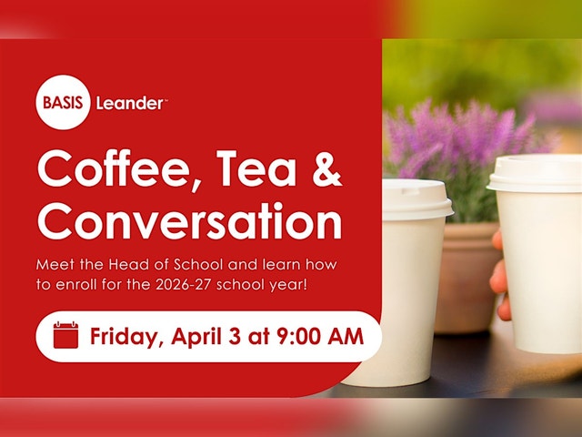 Join us for a casual coffee, tea, and conversation with BASIS Leander’s Head of School on Friday, April 3rd at 9:00 a.m. Meet with Head of School, Christopher Lester, view renderings of our beautiful campus, and ask questions about the upcoming 2026-27 school year. Learn about our accelerated middle school curriculum for grades K-8, robust student support system, and variety of enriching extracurriculars, and learn how to enroll your student. BASIS Texas Charter Schools Leander Office 901 Cypress Creek Rd, Suite 102 Cedar Park, TX 78613 BASIS Leander's office is located next door to Buttercup Dental at the intersection of Cypress Creek Rd and Cluck Creek Trail. Tickets are limited and this event is for parents only. Don’t miss this opportunity to be among the first to learn about our brand new Leander campus. RSVP today! BASIS Charter Schools provide world-class, tuition-free K–12 education. We have 40+ campuses across Arizona, Louisiana, Texas, and Washington, D.C. To view a complete list of our schools, visit enrollBASIS.com [https://enrollbasis.com/].