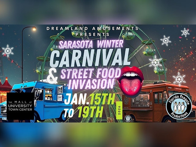 ENTRY & PARKING IS FREE FOR THIS EVENT - Ride Wristbands available at the box office all weekend Sarasota Winter Carnival & Street Food Invasion January 15th-19th, 2026 (MLK Weekend) The Mall at University Town Center, Sarasota, FL Get ready for an incredible weekend with hundreds of food options, fun for all ages, and exciting carnival rides by Dreamland Amusement at the Sarasota Winter Carnival! From January 15th through 19th, bring the whole family to enjoy this spectacular event packed with entertainment, amazing food, and thrilling activities for all ages. Thursday 5:00pm - 10:00pm (soft opening - no street food vendors) Friday 5:00pm - 11:00pm Saturday 12:00pm - 11:00pm Sunday 12:00pm - 11:00pm Monday 12:00pm - 9:00pm (Carnival details available online at www.dreamlandamusements.com for the latest info) Vendors can set up Friday, Saturday, Sunday & Monday and match carnival hours. Contact (727) 674-1464 or Kevin@FloridaPenguinProductions.com for vendor and/or event information. Official Vendor Application [https://lp.constantcontactpages.com/ev/reg/vmh7qa7]
