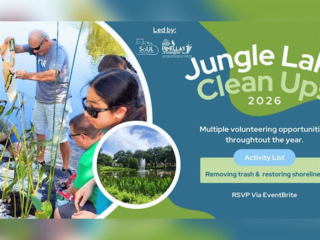 Join Stewards of Our Urban Lakes for a monthly cleanup at Jungle Lake! Join Stewards of Our Urban Lakes (SOUL) in partnership with Keep Pinellas Beautiful (KPB) each month for a rewarding morning of community improvement at Jungle Lake! Throughout the year, volunteers will have the opportunity to assist with lake debris removal, invasive vegetation removal, native plant installation, and water sample collection. Please note: Volunteers under the age of 18 must be signed for by a parent or guardian. *** WHERE TO MEET: Please meet near the Walter Fuller Dog Park - 7901 30th Ave N. St. Petersburg, FL 33710 (See map below). TIME: Start time will vary by date. Please arrive a few minutes early to sign in. WHAT TO WEAR: Please wear closed toed shoes such as boots or sneakers and clothing you don't mind getting dirty. We recommend bringing a hat, sunglasses, and refillable water bottle. WHAT TO EXPECT: All supplies will be provided including gloves, waders, trash bags, pickers, sunscreen, bug spray and hand sanitizer. A water refill station will be available. PARKING: Available in the lots onsite. Carpooling is encouraged! *** **Please note: There is no need to print your tickets** VOLUNTEERS WILL BE NOTIFIED VIA EMAIL IN THE EVENT OF A CANCELLATION If you have any questions, please contact Megan Jackson, Program Coordinator, at mjackson@kpbcares.org or contact our office at 727-533-0402.