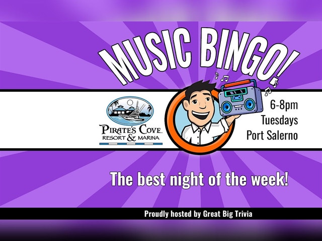"OLD FLORIDA" CHARM IN A GORGEOUS CONTEMPORARY SETTING! Great Big Trivia brings Music Bingo to the iconic Pirate's Cove Resort and Marina every Tuesday from 6-8pm! Nestled on the scenic Manatee Pocket in Port Salerno (Stuart), Florida, Pirate's Cove offers a unique glimpse into Old Florida's relaxed lifestyle. Imagine enjoying the cool evening breeze off the water, the gentle sounds of the marina, and the excitement of Music Bingo. It's an evening of fun, friendly competition, and the chance to win great prizes, all while soaking up the beautiful waterfront setting. Don't worry if you can't remember the name of that hit song, we'll tell you the titles so everyone can play and have fun! Best of all, it's FREE to play! Fuel up for the fun with delicious food from Pirate's Cove's menu. Whether you're craving fresh seafood, juicy burgers, or something lighter, they have something to satisfy everyone's appetite. Music Bingo night is open to the public, so gather your friends, grab a drink from the bar, and try your luck at Tuesday Night Music Bingo at Pirate's Cove!
