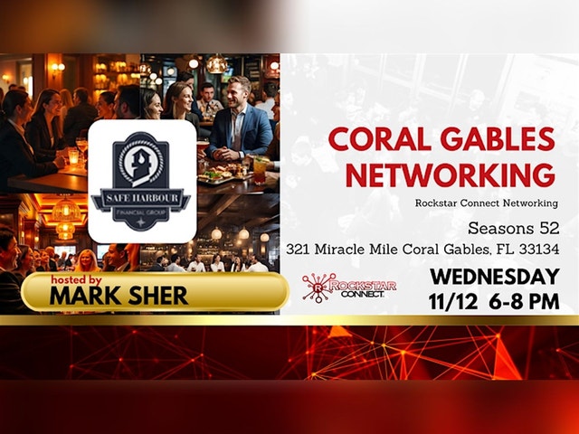 Your Community Starts Here in Coral Gables! What if building your network was as easy as sharing a laugh and a story? This isn’t your typical rigid networking — Coral Gables Networking powered by Rockstar Connect is where authentic relationships take root. More than an event, it’s a chance to be part of something bigger, meet genuine people, and discover shared passions. Join Mark Sher [https://www.facebook.com/mark.sher.37] for an evening of meaningful connection on Wednesday, November 12, 2025, from 6 PM to 8 PM at Seasons 52 [https://www.facebook.com/Seasons52CoralGables/]. Whether you’re an entrepreneur, professional, or neighbor looking to get more involved, you’ll feel right at home from the moment you arrive. Everyone is welcome. Come as you are. Leave with new friendships and a stronger sense of belonging. Join our Facebook Group: Coral Gables Networking powered by Rockstar Connect [https://www.facebook.com/groups/1530498090397196/] Visit our landing page: https://rockstarconnect.com/coral-gables/ [https://rockstarconnect.com/coral-gables/] Mark Sher http://www.safeharbourfinancialgroup.net/ [http://www.safeharbourfinancialgroup.net/] Rockstar Connect https://www.rockstarconnect.com/ [https://www.rockstarconnect.com/] Power up your networking with YEEGO! We're taking the incredible atmosphere of Rockstar Connect and amplifying its power. Now, the energy you feel in the room is matched by the intelligence in your hand, ensuring every spontaneous chat has the potential to become a strategic partnership... Make it happen, install the app now! - https://yeego.app/pods/bspsdi66xjx83k0 [https://yeego.app/pods/bspsdi66xjx83k0] All attendees are welcome, either living in or visiting the South Florida area, Miami-Dade County, FL Broward County, FL, Palm Beach, FL, Monroe Country, FL, Greater Miami, Florida area: South Miami, FL, Coral Terrace, FL, Glenvar Heights, FL, Kendall, FL, Westchester, FL, Pinecrest, FL, Sunset, FL, Olympia Heights, FL, University Park, FL, Key Biscayne, FL, Miami Springs, FL, Sweetwater, FL, Cutler, FL, Gladeview, FL, Coconut Grove, FL, Sunrise Harbor, FL, Gables Estates, FL, South Bay Estates, FL, Ocean View Heights, FL, Ludlam, FL, The Pines, FL, Silver Bluff Estates, FL, Coral Terrace, FL, Bay Heights, FL #events #networking #businessnetworking #connection #smallbusiness #entrepreneurship #business #meetup #opportunities #coralgables #florida #rockstarconnect