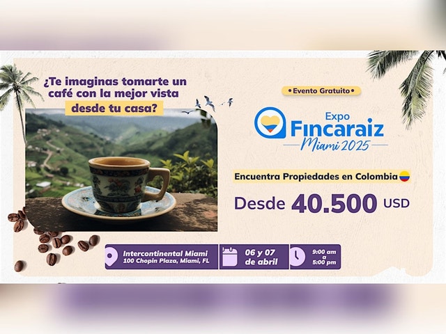 Expo Finca Miami 5 y 6 de abril - 9 am a 6 pm | Intercontinental Miami - Entrada gratuita * Descubre propiedades desde USD 40.500 * Encuentra unidades en Bogotá, Barranquilla, Cartagena, Santa Marta, Itagüí, Jamundí, Cali, Medellín, Granada, Pereira, Fusagasugá y La Vega. * Explora apartamentos, casas y lotes de las mejores constructoras del país. * Aprovecha descuentos exclusivos y planes de financiación a tu medida. * Accede a información detallada y confiable para tomar decisiones inteligentes. No pierdas esta oportunidad única. ¡Asegura tu lugar ahora mismo!