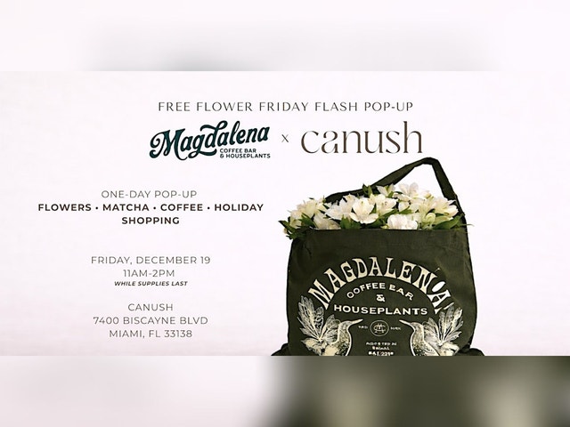 In true flash-pop-up fashion, family-owned local coffee shop Magdalena [https://www.instagram.com/magdalena.coffee/] brings its cult-favorite Free Flower Friday to Canush [https://www.instagram.com/canushmiami/] for one day only. Shop the Canush showroom for design-forward furniture and home décor, then enjoy coffee, matcha, or chai from Magdalena - plus flowers on us. The perfect moment for last-minute holiday shopping. This pop-up is a celebration of community, collaboration and a feel-good Friday moment. While supplies last. First-come, first-served. @CanushMiami [https://www.instagram.com/canushmiami/] @Magdalena.Coffee [https://www.instagram.com/magdalena.coffee/]