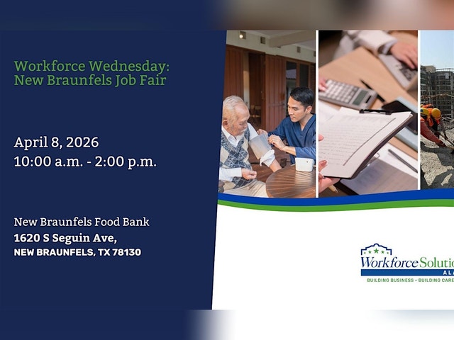 WORKFORCE SOLUTIONS ALAMO: WORKFORCE WEDNESDAY - NEW BRAUNFELS FOOD BANK Looking to boost your career? Join us in person for the Workforce Solutions Alamo Workforce Wednesday at the New Braunfels Food Bank! It's a friendly event where you can connect, learn about job opportunities, and get helpful tips to jumpstart your job search. Don't miss out on a chance to network and gain valuable resources—all under one roof. Swing by and take a step toward your future!