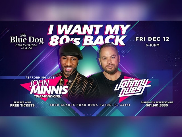 I Want My 80's Back "Freestyle Throwback" with John Minnis & DJ Johnny Quest Live! Join us for the ultimate FREE “Freestyle Throwback” event on Friday, December 12th from 6–10PM at The Blue Dog in Boca Raton! Enjoy a night of nonstop classics featuring John Minnis performing the classic hit “Diamond Girl” and more - plus DJ Johnny Quest, spinning the best in Hip-Hop, R&B, Dance, Freestyle, Miami Bass, and everything in between. 🎟 Tickets are FREE, but reservations are required and space is limited. Each party may reserve up to 6 tickets - grab yours before they’re gone! ⏰ 🍸 Dinner & VIP Table Reservations: 561.961.3330 📍 Location: Town Center Mall — 6000 Glades Rd, Suite 1008C, Boca Raton, FL 33431